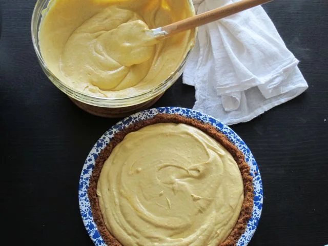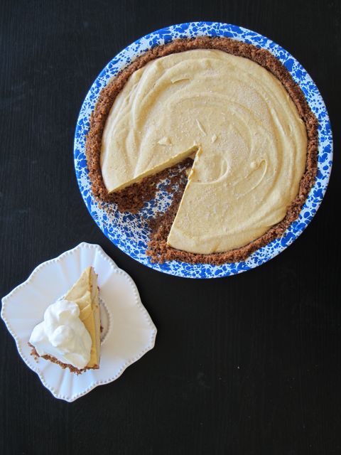 Like any epic meal, I'm starting with dessert here, with a twist on a pumpkin pie. I am an unabashed lover of pumpkin pie in its classic form, with a rich pumpkin custard topped with a giant mound of whipped cream. But apparently, I am in a minority among those who find the real thing too eggy, or jiggly, or just passe. Plus, pumpkin pie is that one Thanksgiving dessert that annoyingly cannot be made in advance and so must either be purchased or allowed to hog precious oven space. Hopefully, this version will solve all of those problems.