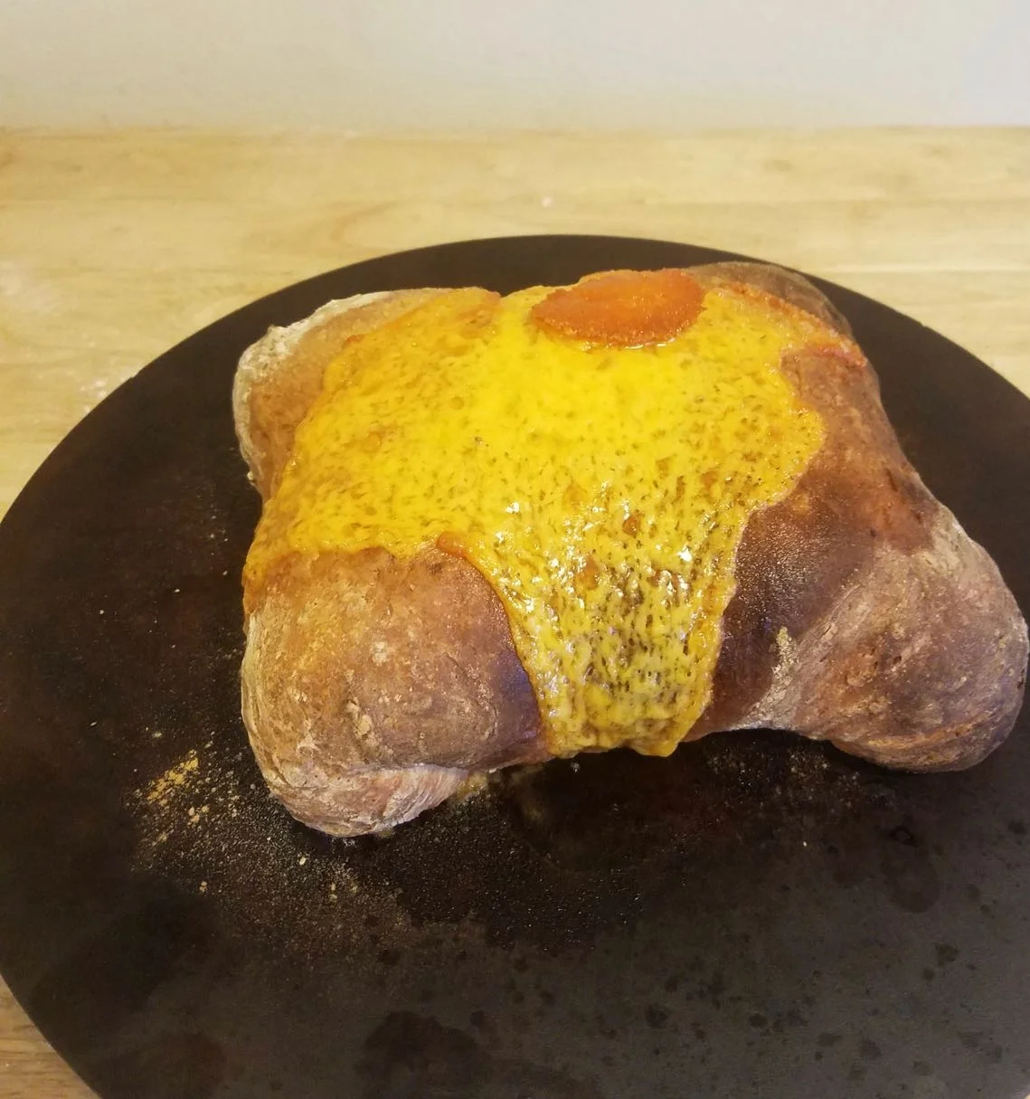 - Grate extra cheese or place some slices on top, score top lightly with knife, and add some additional flour on top.