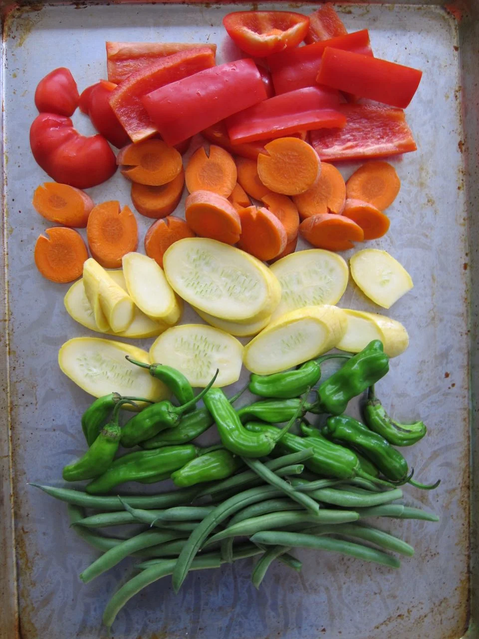 - 4 cups ( more, honestly) of veggies, I used summer squash, carrots, bell peppers, green beans, and shishito peppers (see note)