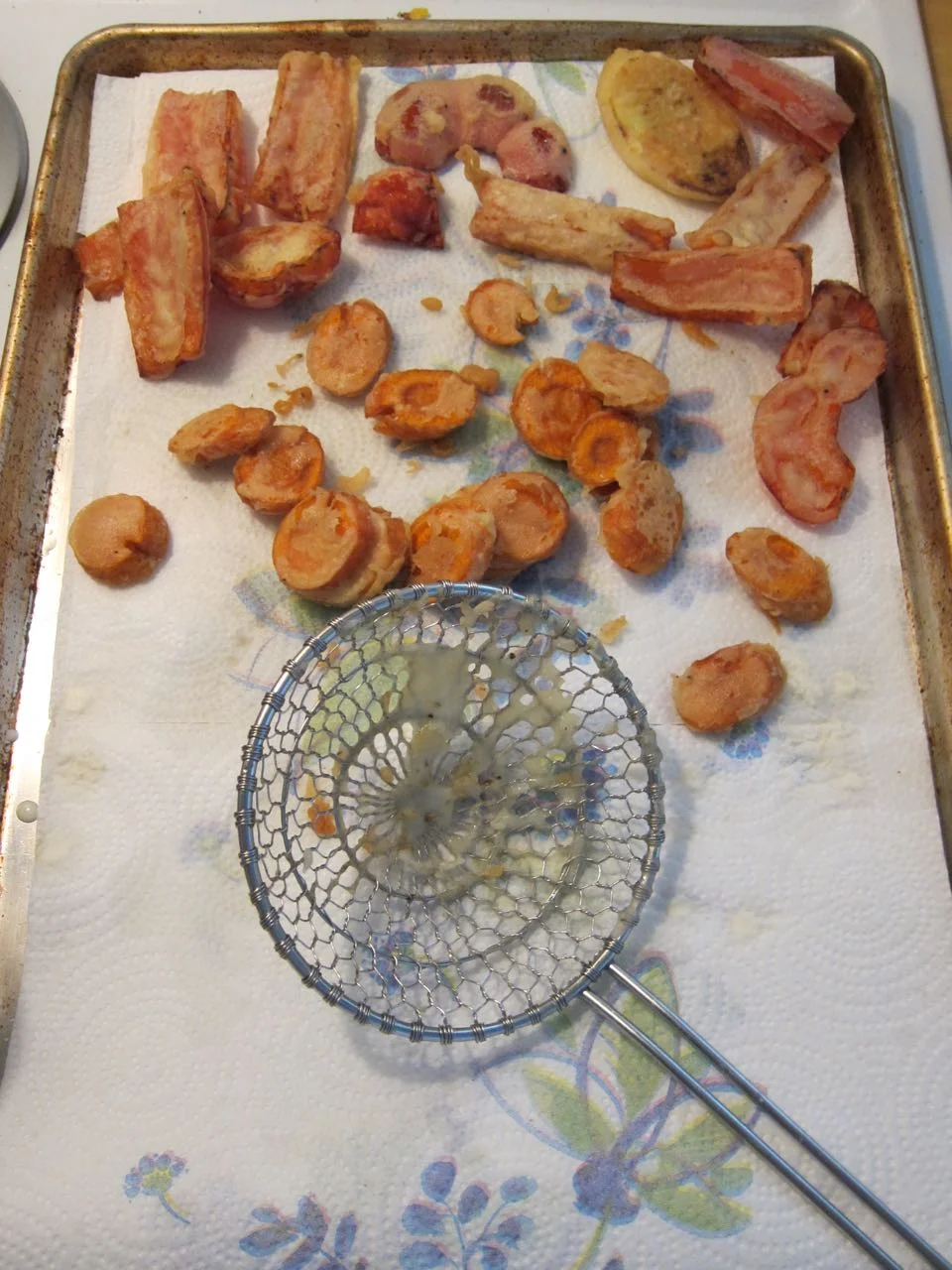 - For veggies, cut peppers into large chunks, and carrots and squash into thick slices. Carrots can be blanched before dipping in batter but I didn't really mind the crispier version that comes from skipping this. Green beans just need ends snapped off, and shishito peppers need no prep except steely nerve- they might explode so keep your distance while frying or use a splatter screen.