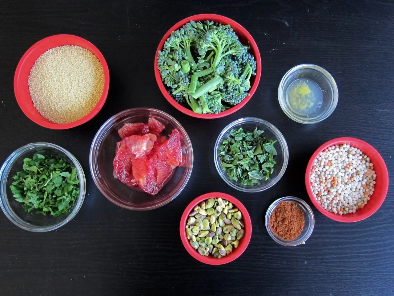 Two Couscous Salad with Labneh, Broccolini, and Blood Orange