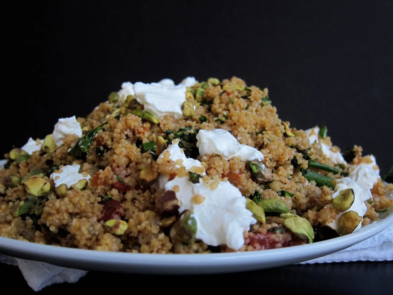 - In a large bowl, combine both the couscouses and fluff with a fork. Add the herbs and toss with the lemon zest and juice and a little olive oil, about a tsp. Taste and adjust seasoning, then add the broccolini and blood oranges. Garnish with pistachio and labneh and serve.